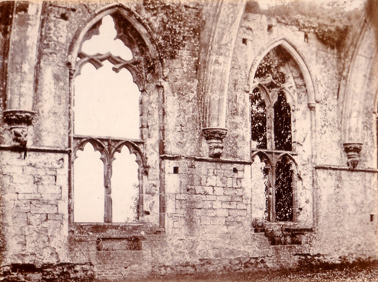 Photo of Great Hall windows just before restoration (Mayfield).