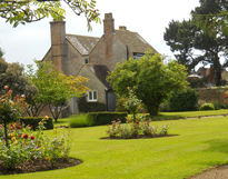 Photo of gardens and "Stone House." (Mayfield)