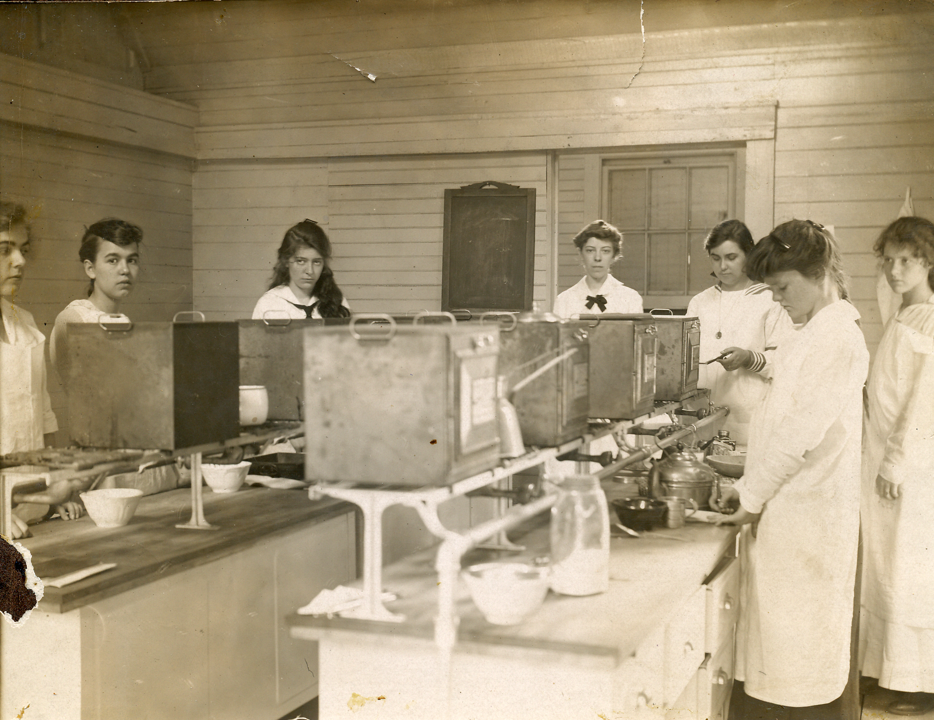 Academy of the Holy Child Jesus, Sharon Hill, PA, 1864-1973. Photo of bake house. Inscription on reverse: "Interior of old Bake House where our SHCJ pioneers used to bake and where later Sr. Benedict Kelly kept the baby chickens. In 1914 it was used for teaching Domestic Science. The two teachers were Miss Payne and Miss Aiken. No reflection on their efforts." |