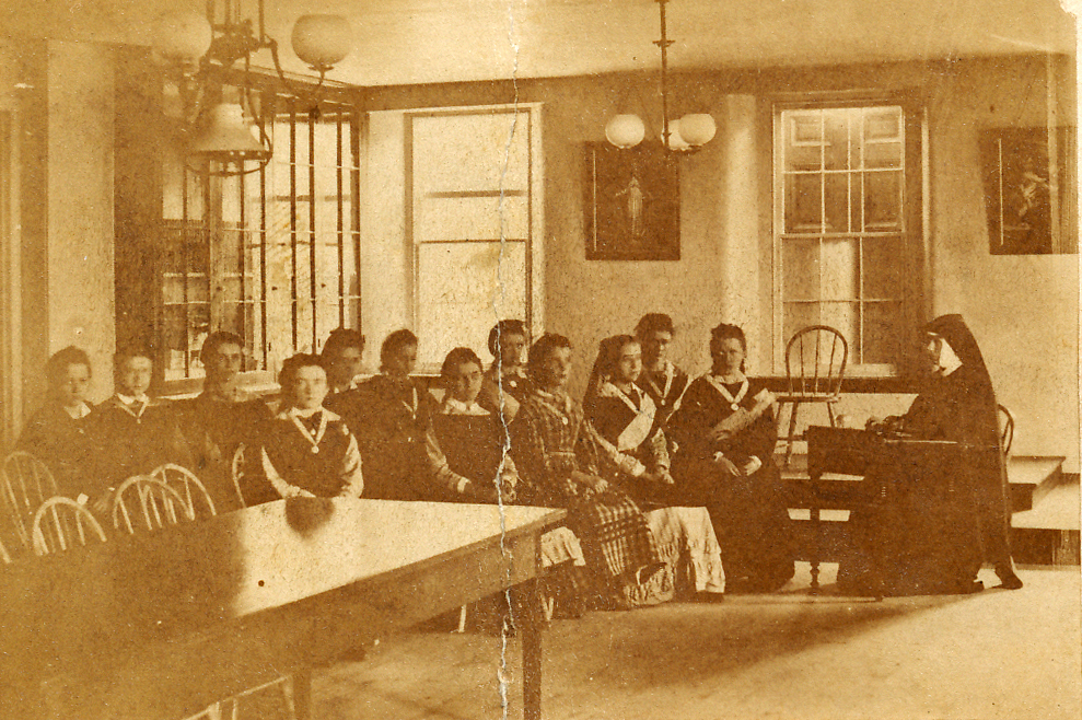 Academy of the Holy Child Jesus, Sharon Hill, PA, 1864-1973. Photo of students and sister in first school hall/community room. |