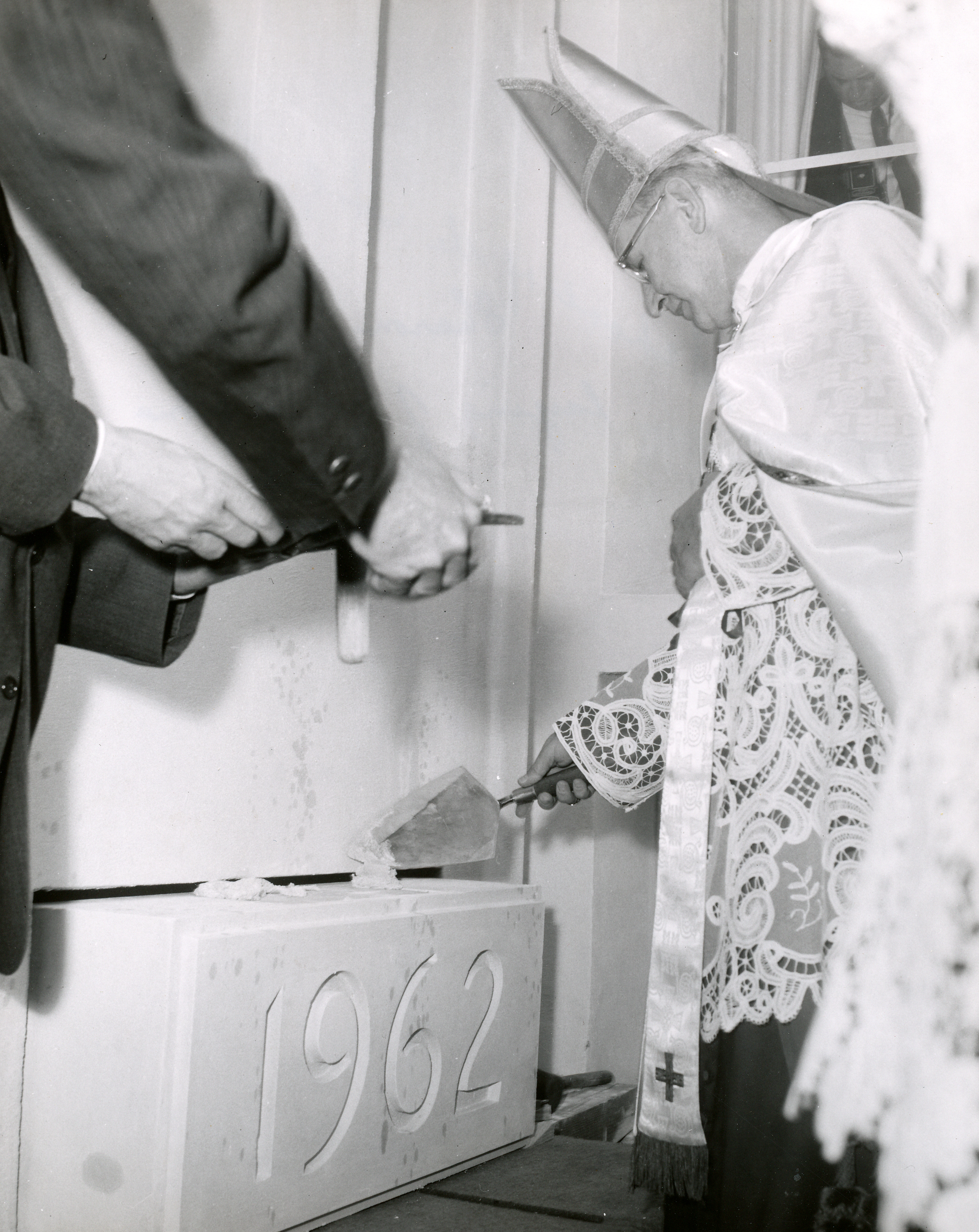 Academy of the Holy Child Jesus, Sharon Hill, PA, 1864-1973. Photo of Archbishop Kroll laying cornerstone and blessing classroom in new high school building. |