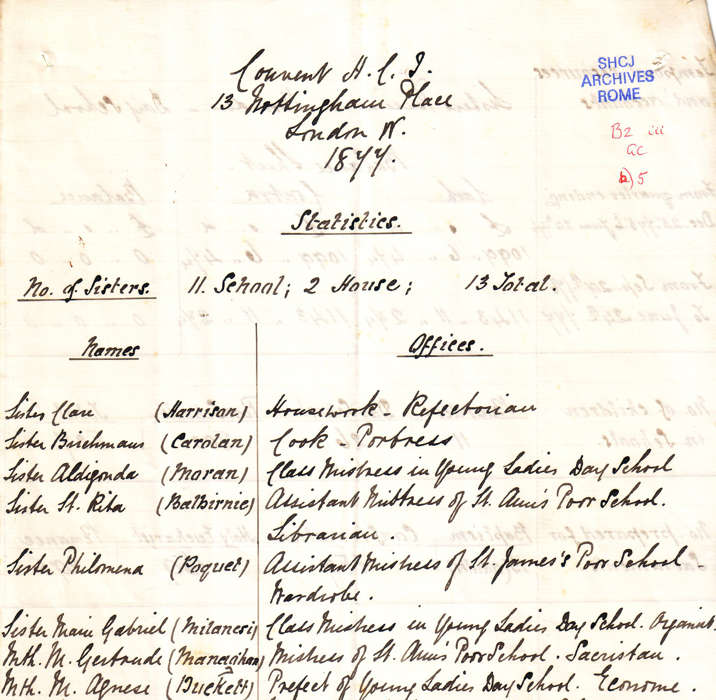 Convent and School of the Holy Child Jesus, Cavendish Square, London. Convent statistics for Nottingham Place in 1877. |