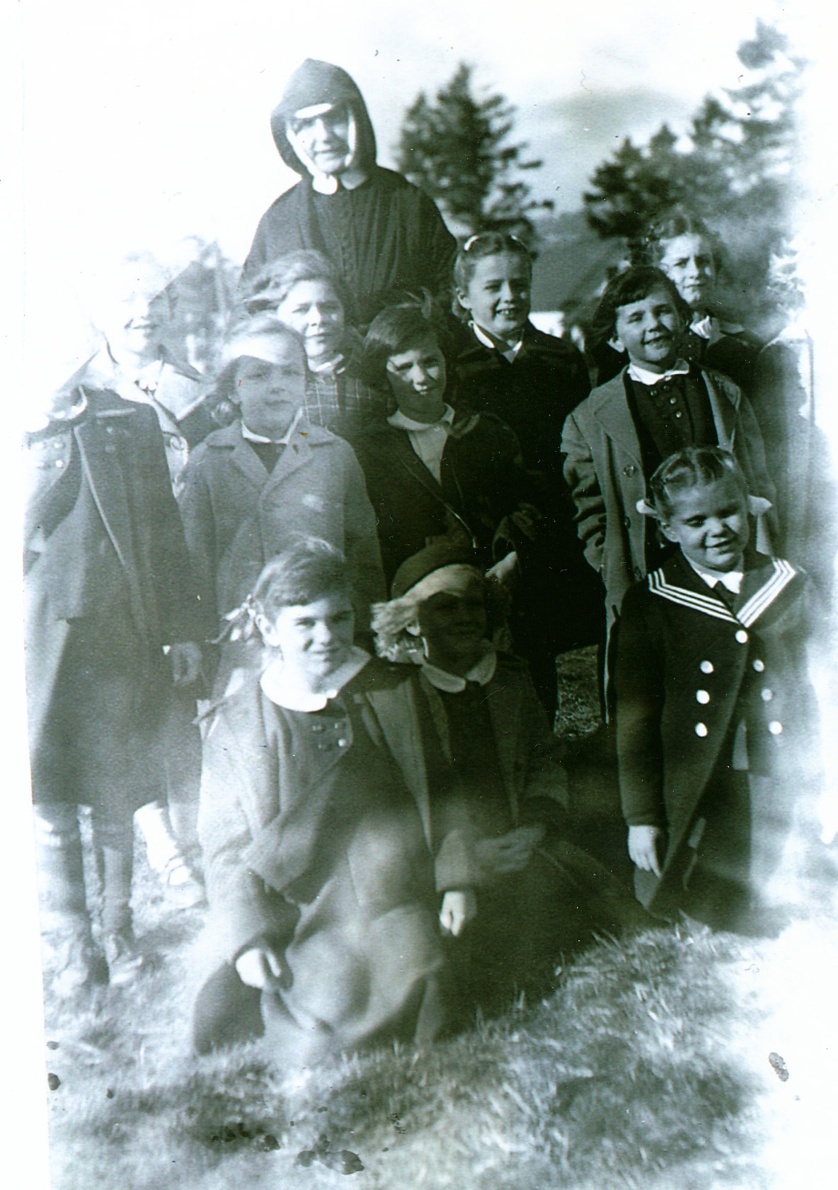 Holy Family Parish, Portland, Oregon, 1948 (1960?) - 1976. Photo of Sr. Frances McCort with grades 1 and 2 at recess. |