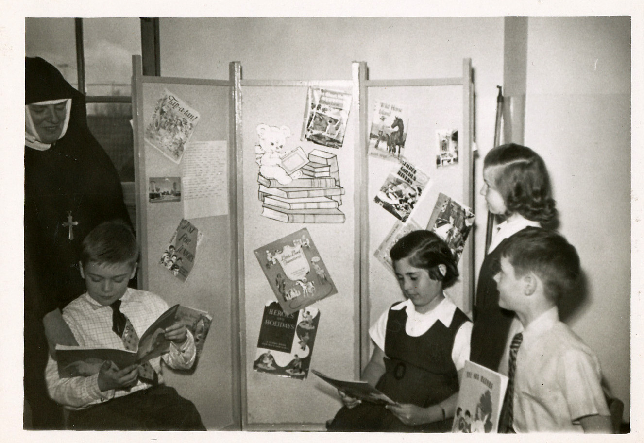 Holy Family Parish, Portland, Oregon, 1948 (1960?) - 1976. Photo of Srs. Teresa O'Leary and M. Cyril and class of? |