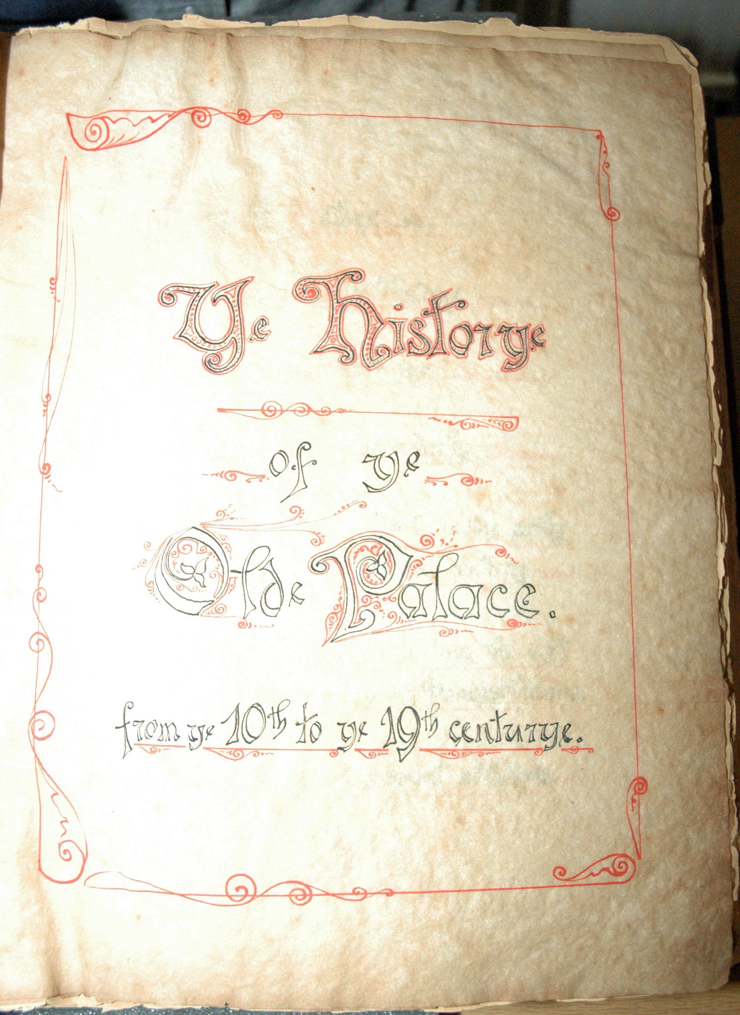 St. Leonards - Mayfield, Mayfield, Sussex, England. Originally Mayfield School of the Holy Child. Page of book created by students and teachers; book covers history of the "olde Palace" from the 10th to 19th centuries; wooden cover carved by students; signature of Queen Victoria to commemorate her visit to Mayfield. |