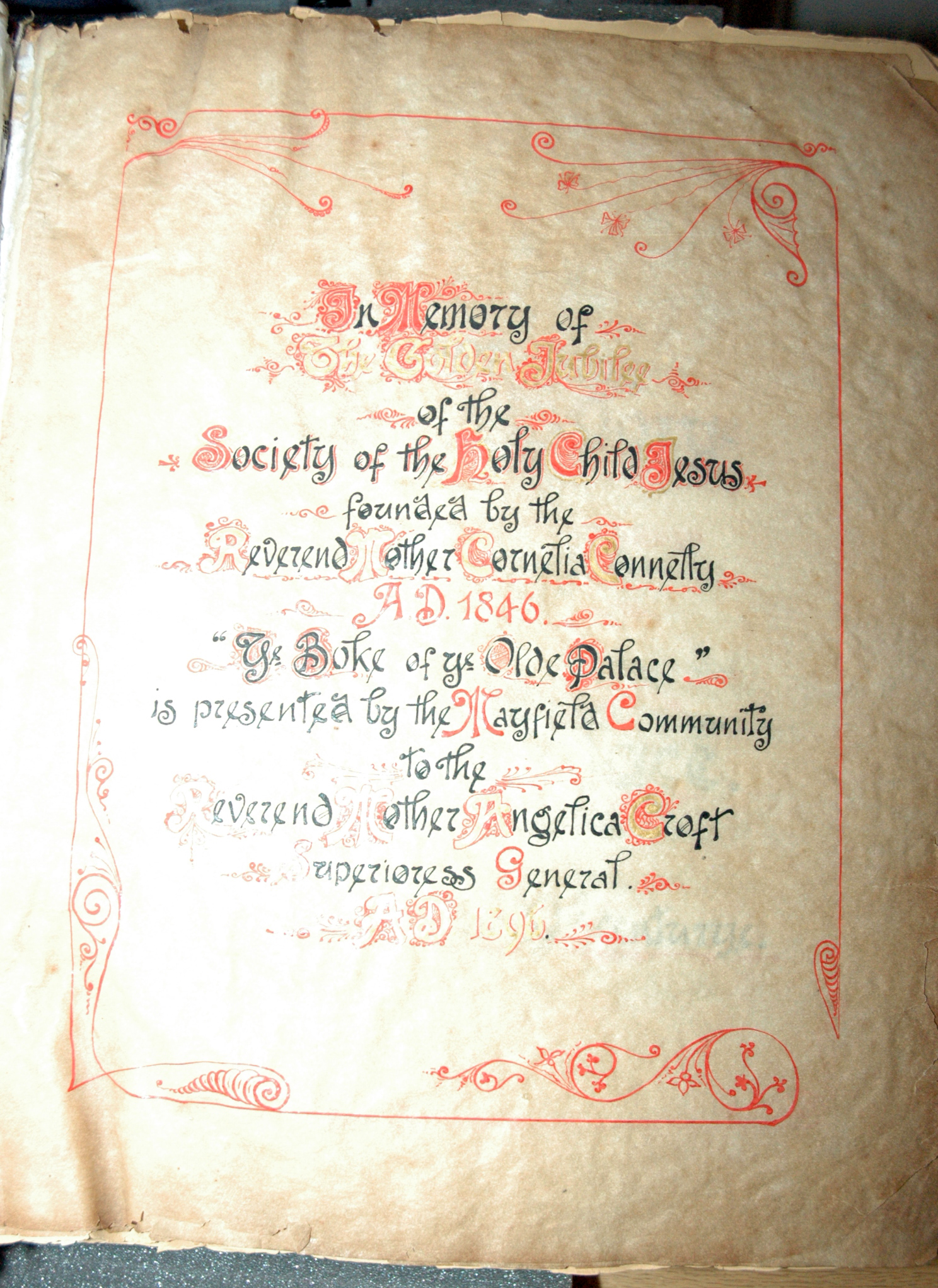 St. Leonards - Mayfield, Mayfield, Sussex, England. Originally Mayfield School of the Holy Child. Page of book created by students and teachers; book covers history of the "olde Palace" from the 10th to 19th centuries; wooden cover carved by students; signature of Queen Victoria to commemorate her visit to Mayfield. |