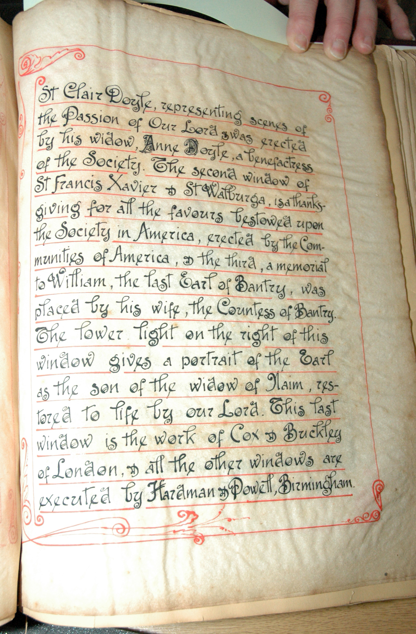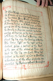 St. Leonards - Mayfield, Mayfield, Sussex, England. Originally Mayfield School of the Holy Child. Page of book created by students and teachers; book covers history of the "olde Palace" from the 10th to 19th centuries; wooden cover carved by students; signature of Queen Victoria to commemorate her visit to Mayfield. |