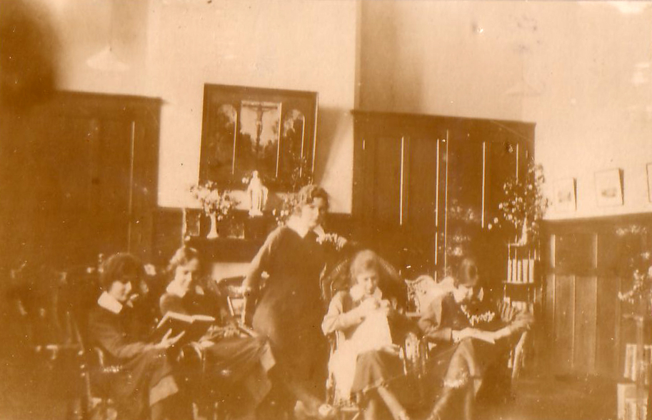 St. Leonards - Mayfield, Mayfield, Sussex, England. Originally Mayfield School of the Holy Child. Photo of 6th form students studying and doing needlework in lounge. |