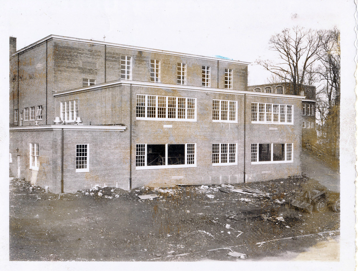 Oak Knoll School of the Holy Child, Blackburn Road, Summit, NJ, 1925 - present. Photo "taken from the art room in Bona_____. You can see the convent addition on the far right. The funny little 'mushrooms' on the left roof are air vents over the kitchen - not noticeable from the ground. Large windows are new cafeteria. Upper story - right: new art room." |