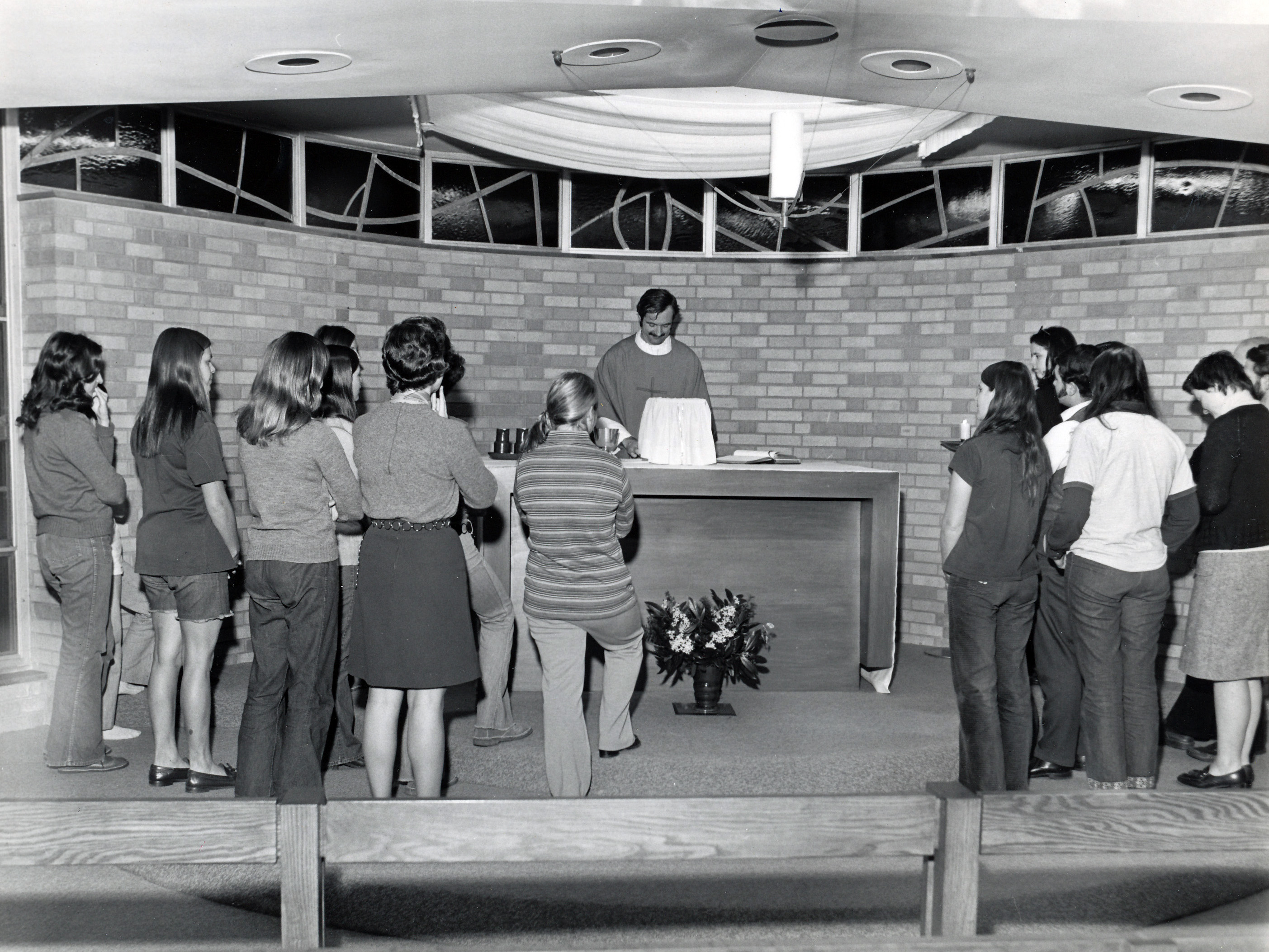 Rosemont College of the Holy Child, Rosemont, Pa 1921 - present. Photo of Father Kunzman celebrating "Roving Mass" in Heffernan Chapel. |
