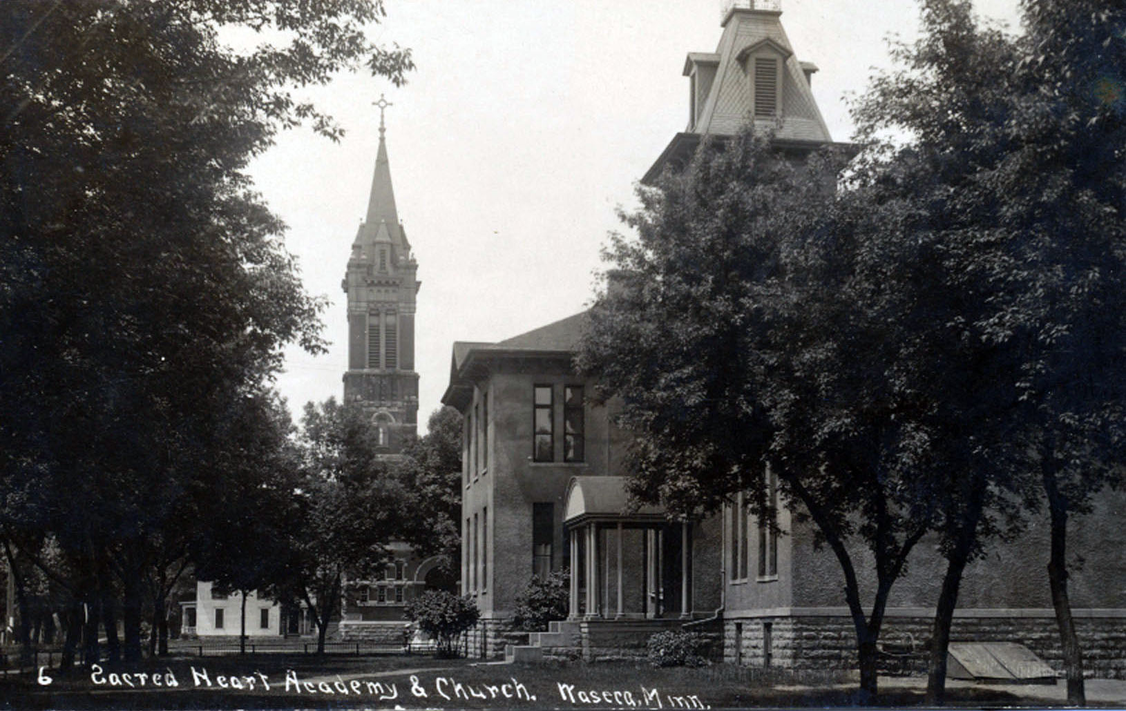 Sacred Heart Academy High School, Waseca, MN, 1886-1994. Photo of school and church.