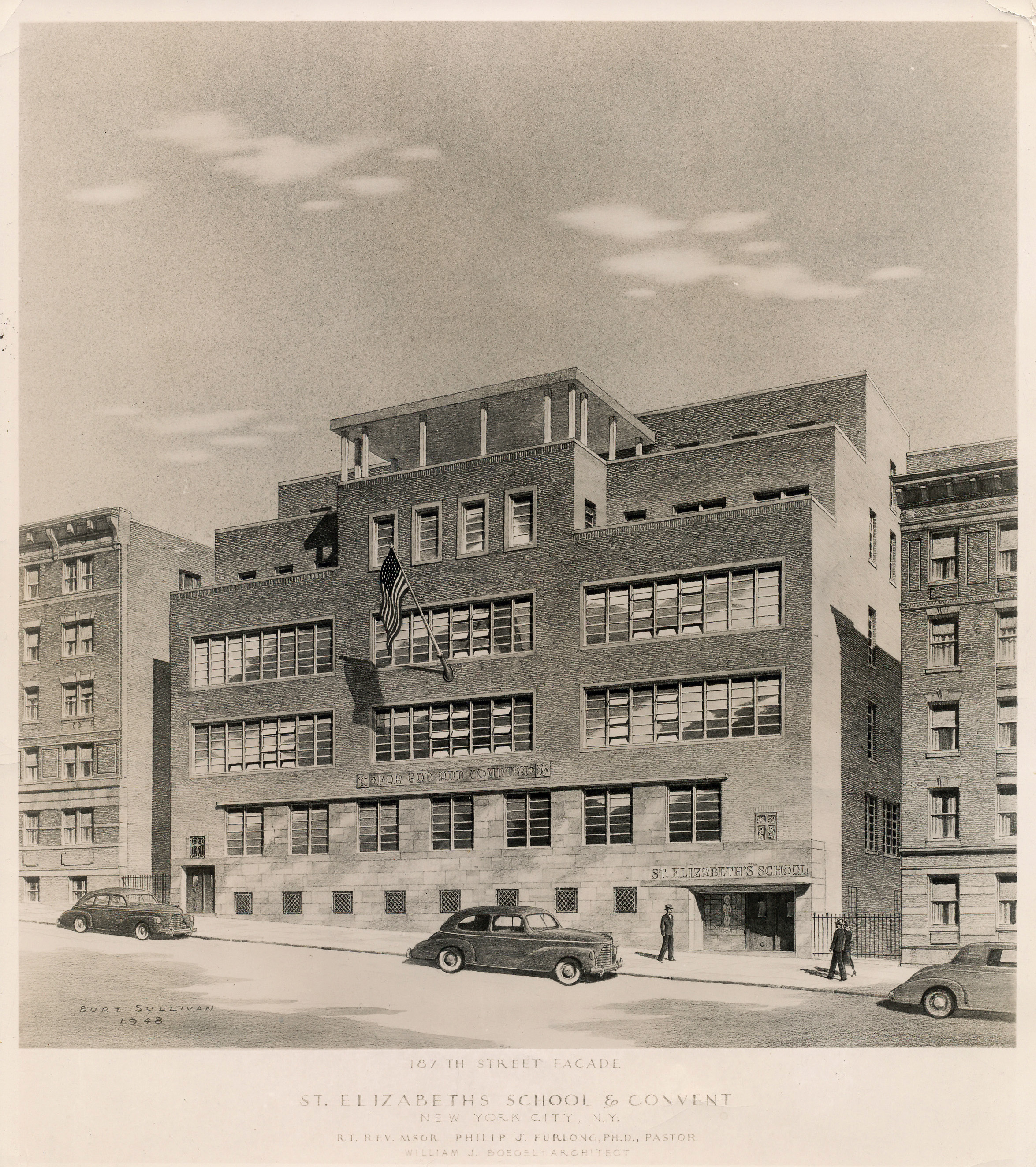 St. Elizabeth's, 187th and Broadway, NYC, 1936 - 1992. Sketch of St. Elizabeth's School. The original building burned down in 1947. The diocese got three school buses and used an empty school building (Most Blessed Sacrament Parish on 125th Street) for three years. The current site was completed at 187th St. between Wadsworth Avenue and St. Nicholas Avenue and reopened during late Fall 1950. |