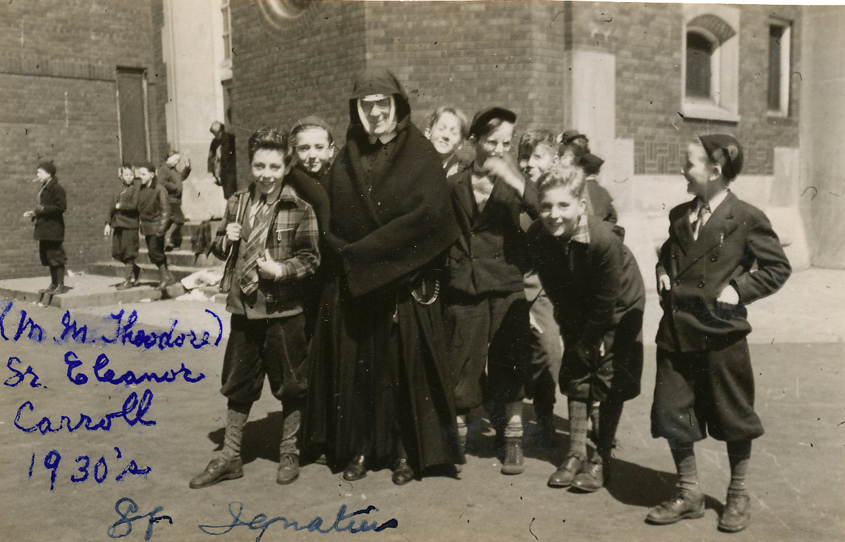 St. Ignatius Parish, Chicago, IL, 1909-1977. Photo of Sr. Eleanor Carroll and students on playground. |