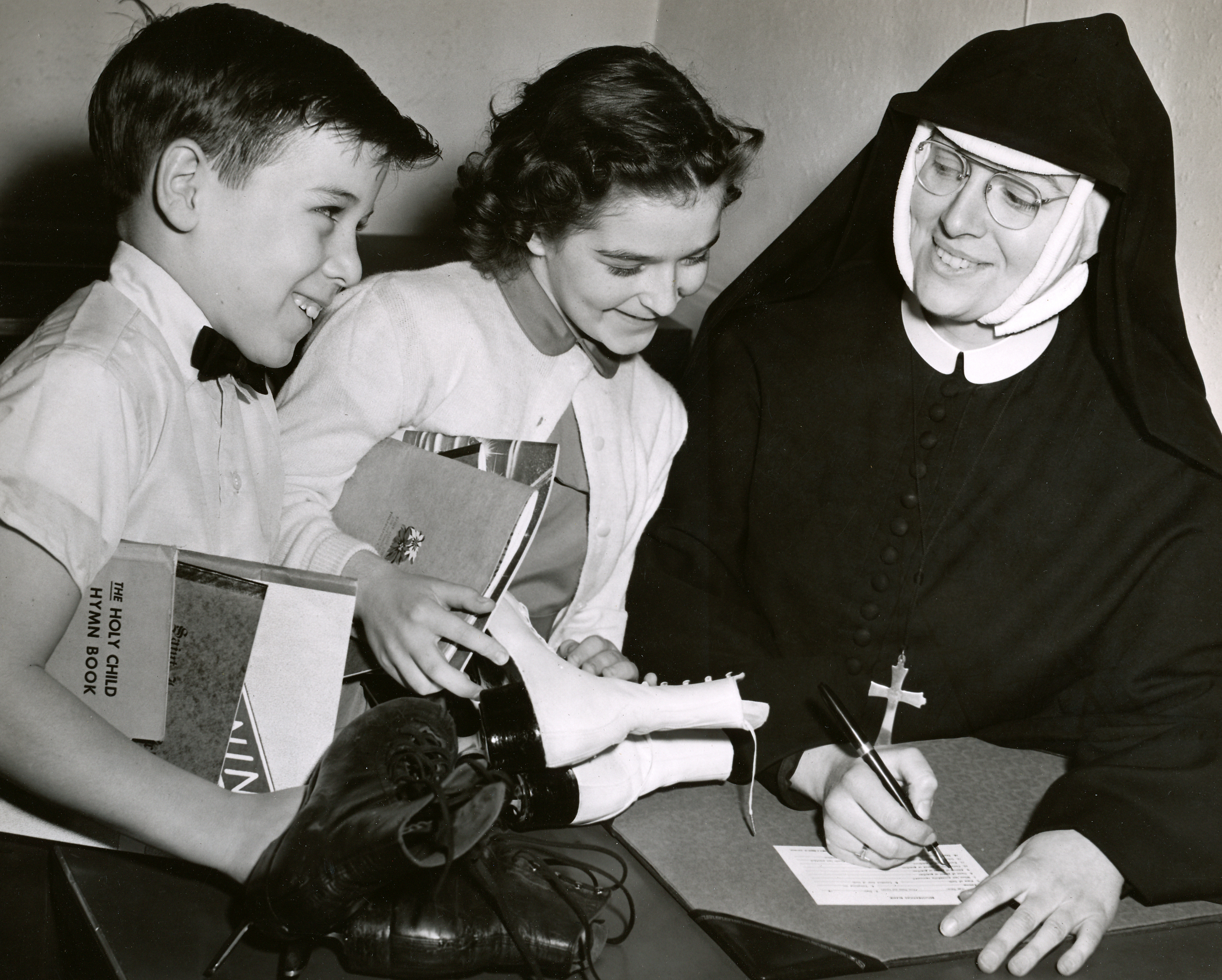 St. James Parish School (later merged with St. Agatha) 34th and Sansom, Phila. - 1870-1967. Photo of M.M. Edwina, Principal (Edwina Menten) registering 2 students from the Ice Follies Troupe for School. |