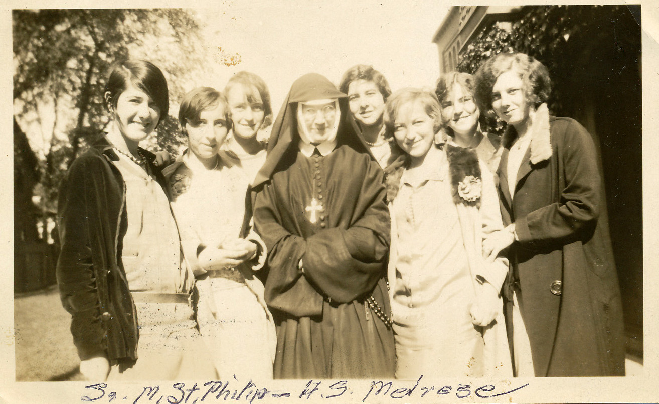 St. Mary's Parish School, Melrose, MA, 1909-1982. Photo of Sr. M. St. Philip with students. |