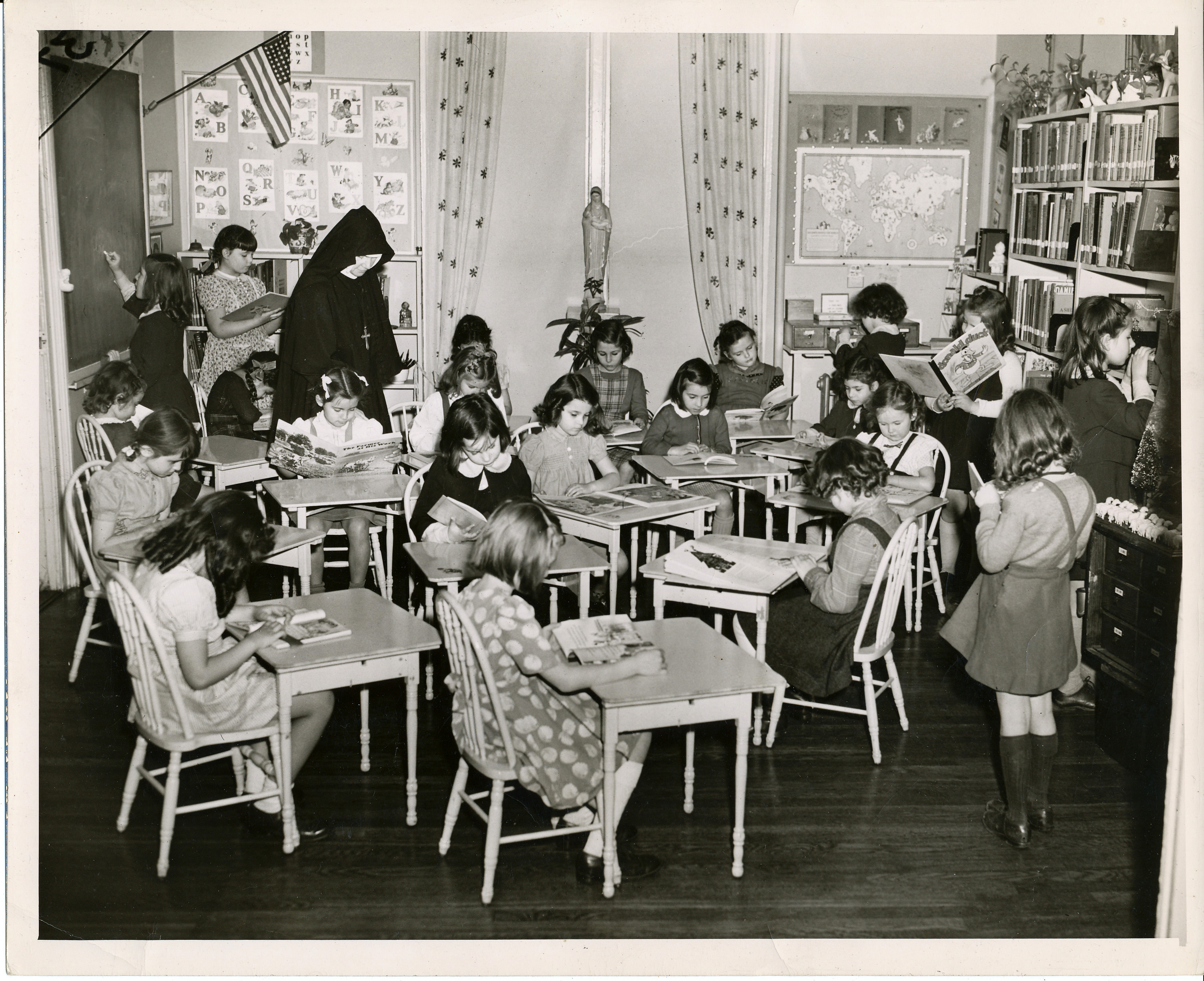 St. Walburga's, W. 104th and (630) Riverside Drive, New York, NY, 1904-1957. Moved to Rye in 1957 and became School of the Holy Child, Rye. Photo of 1st grade students in library with MM Pierre. |