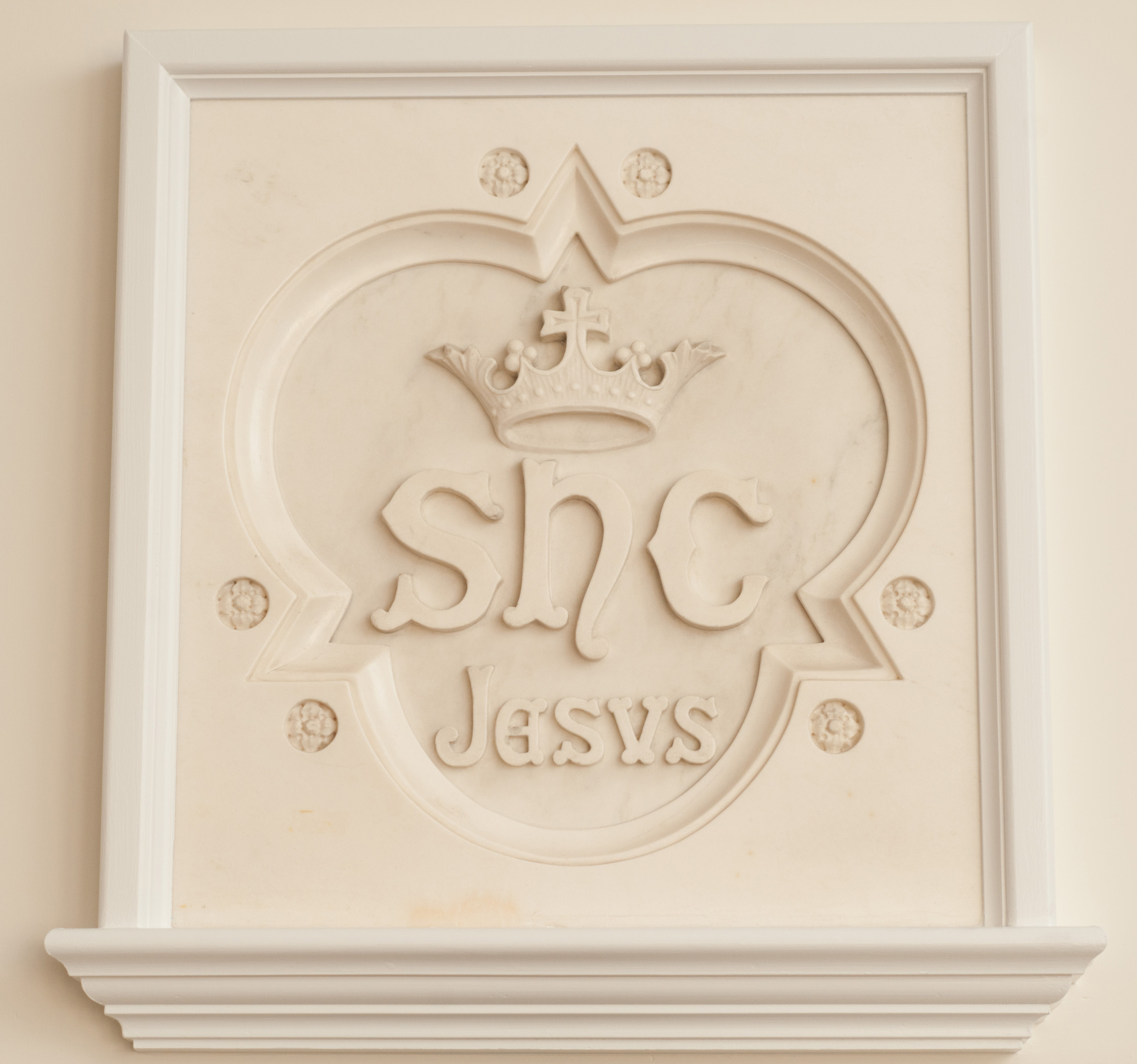Marble SHCJ seal; front altar piece at St. Leonard's in Philadelphia