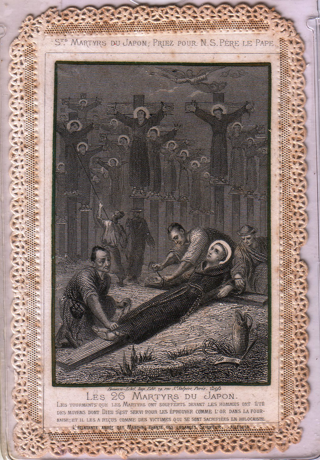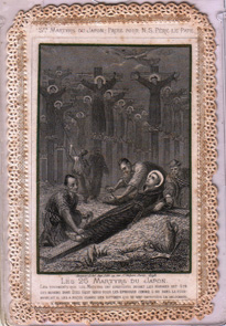 Front of holy card, "Les Martyrs du Japon," given to Cornelia by niece, Bella.
