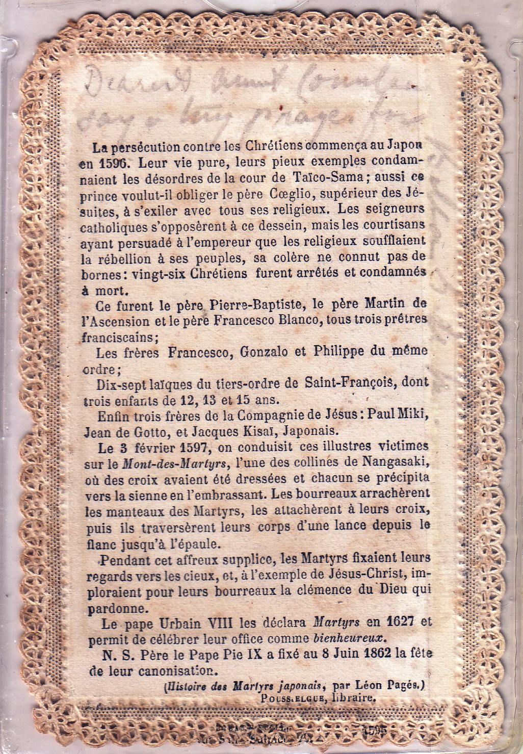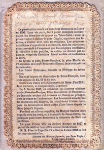 Back of holy card, "Les Martyrs du Japon," given to Cornelia by niece, Bella.