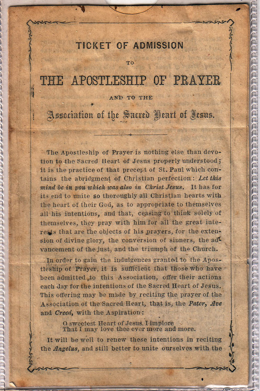 Cornelia's certificate of admission to "The Apostleship of Prayer and to the Association of the Sacred Heart of Jesus." (Front) |