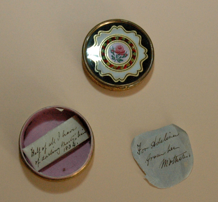 Small tin container holding a lock of Merty's (Mercer's) hair. Note in tin: "Half of all I have of darling Merty's hair, 1834." Separate note: "For Adeline (Adelina?) from her Mother." |