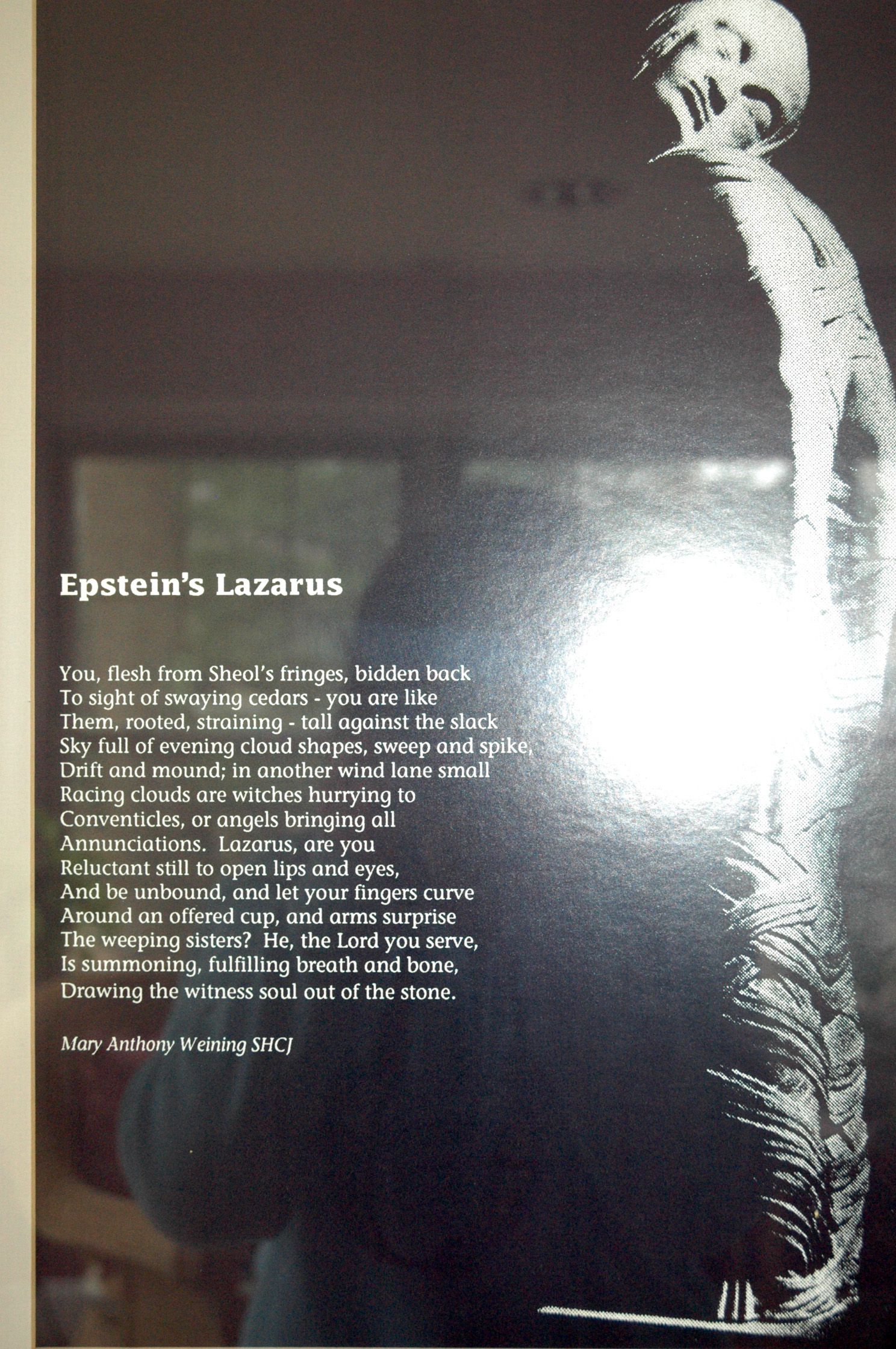 Framed copy of "Epstein's Lazarus," poem by Mary Anthony Weinig. |