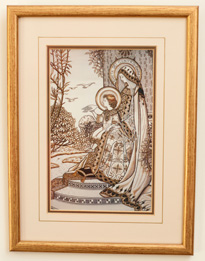 The Madonna and Child. Embroidery piece worked on cream satin with silk and gold thread erroneously attributed to SHCJ. One from a series of thirteen pieces. The full collection resides at The Royal School of Needlework. See "The Litany of Loredo Panels" for more information. |