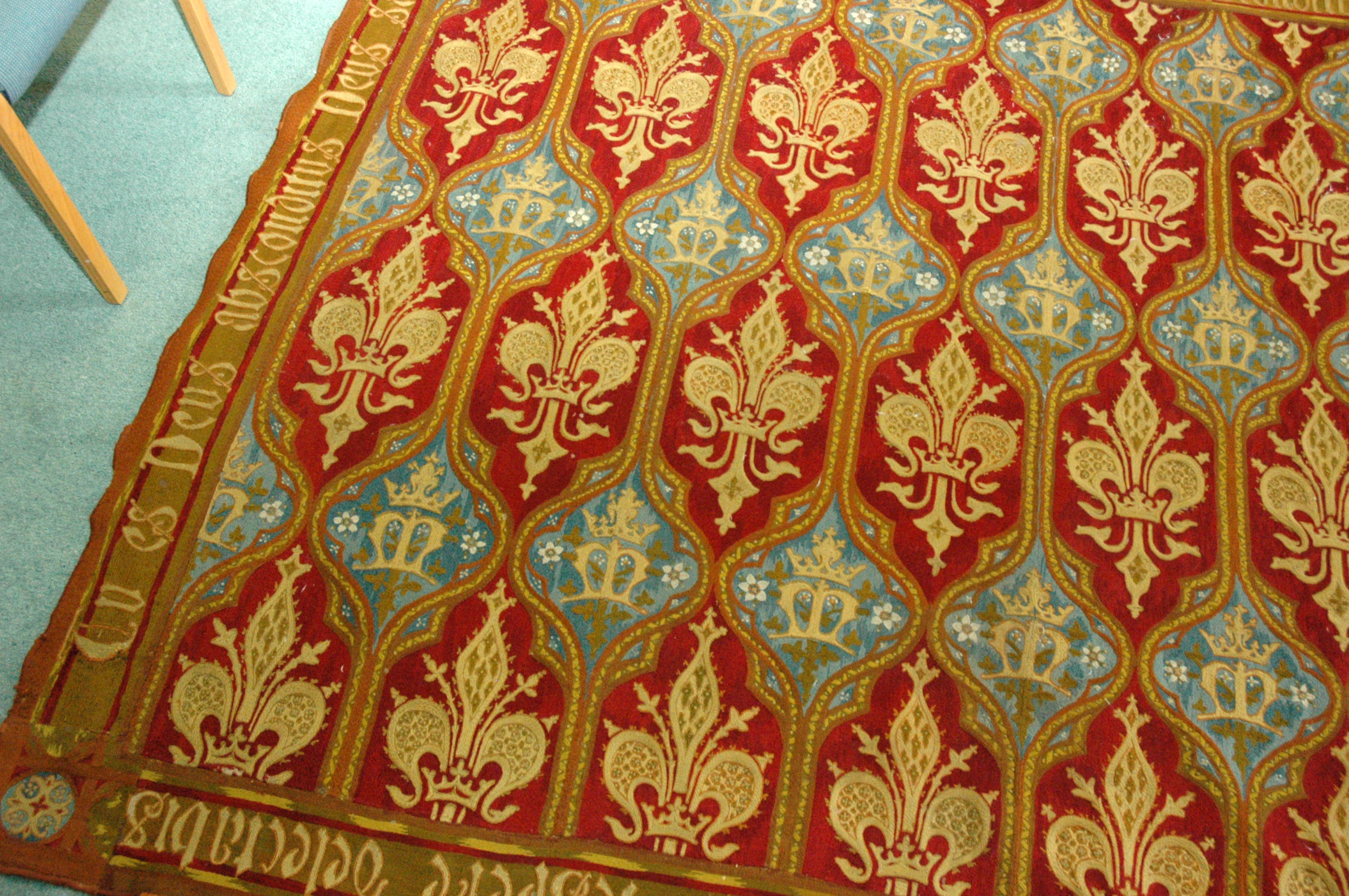 Tapestry rug stitched for Cornelia by SHCJ sisters for aisle of Mayfield Chapel. Stitched in panels then joined; originally ran entire length of chapel. Writing on border speaks of hidden God and delighting in him day and night. |