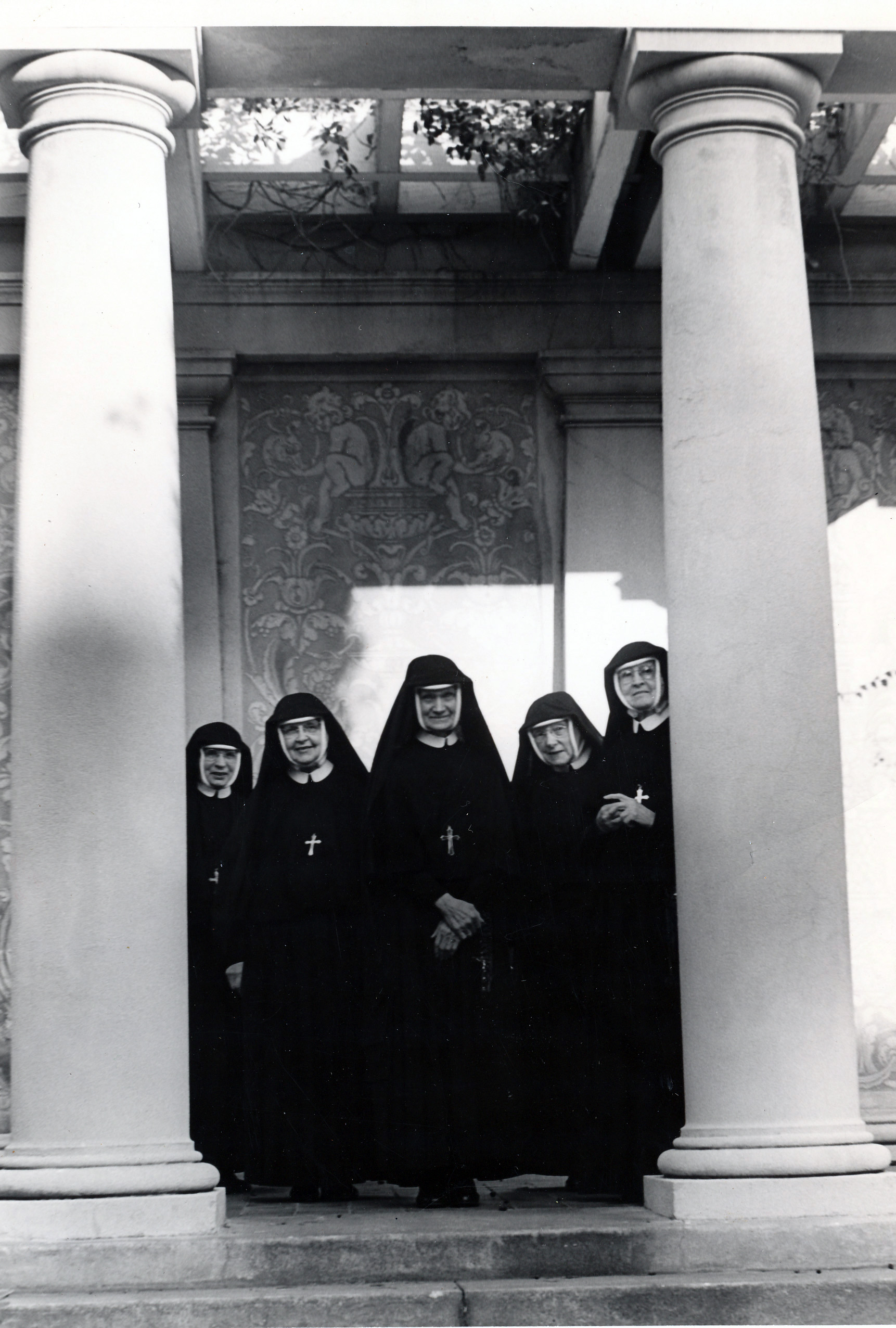 Mayfield Sr. School of the Holy Child Jesus, 500 Bellefontaine Street, Pasadena, CA 1951- present. Photo of sisters under pergola of senior school. |