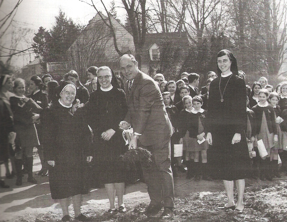 Rosemont School of the Holy Child, 1344 Montgomery Ave., Rosemont, PA; 1949 - present. Ground breaking for first addition which included classrooms, Science lab, Cafeteria and gym. Pictured - Mother Mary Walstan McNelis, Provincial; Mother Elizabeth Gorvin, Superior, Mother Mary Kilian (Helena Mayer),Principal. |