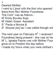 Transcript of a note inserted in the Clothing Register in the European Archives, Oxford. It is a handwritten letter, on a folded sheet of notepaper, from Mother Agatha Deacy to Mother Mary Theophila Laprimaudaye. |