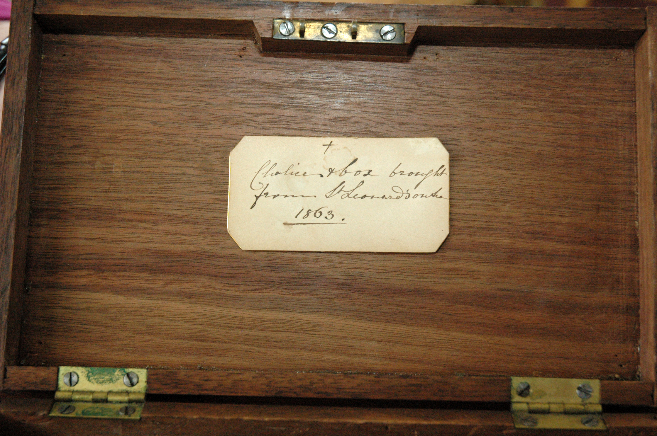 Chalice, paten, ciborium brought to Towanda by the first group of sisters. Consecrated by Bishop Wood. Inscription inside lid of box: "Chalice and box brought from St. Leonard's on Sea, 1863." |