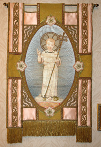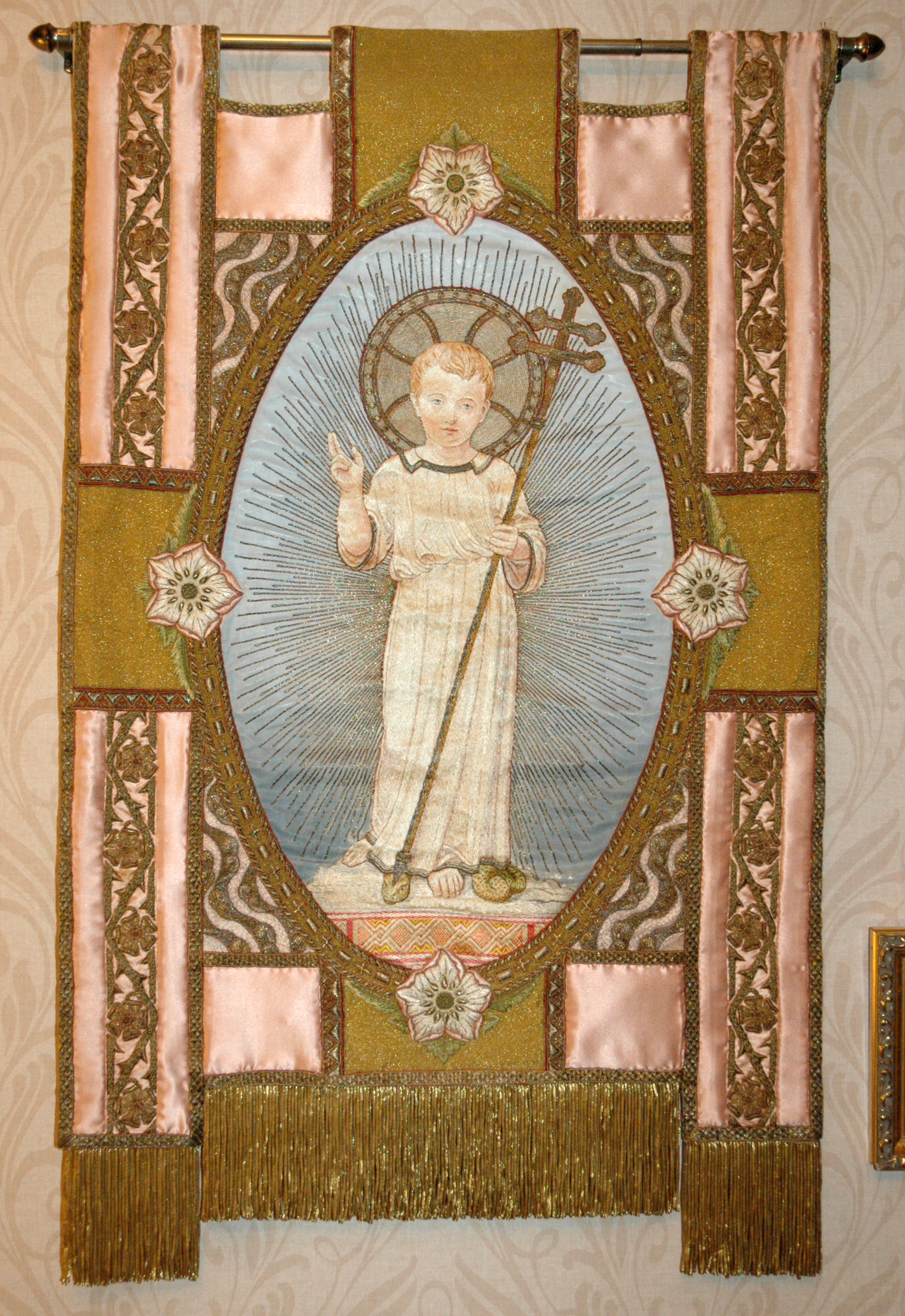 Fabric banner; "The Holy Child banner displayed here has significance for many SHCJ from 1931 until the 1960's, on the 25th of each month, it was carried by the eldest novice as the postulants and novices processed around the chapel at Sharon and then at New Sharon, praying in the traditional manner for vocations to the society. Through the generosity of Marion Dailey it has been restored." |