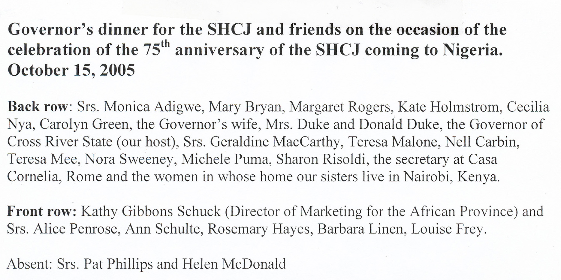 Governor's dinner celebrating 75th anniversary of SHCJ in Nigeria - Details