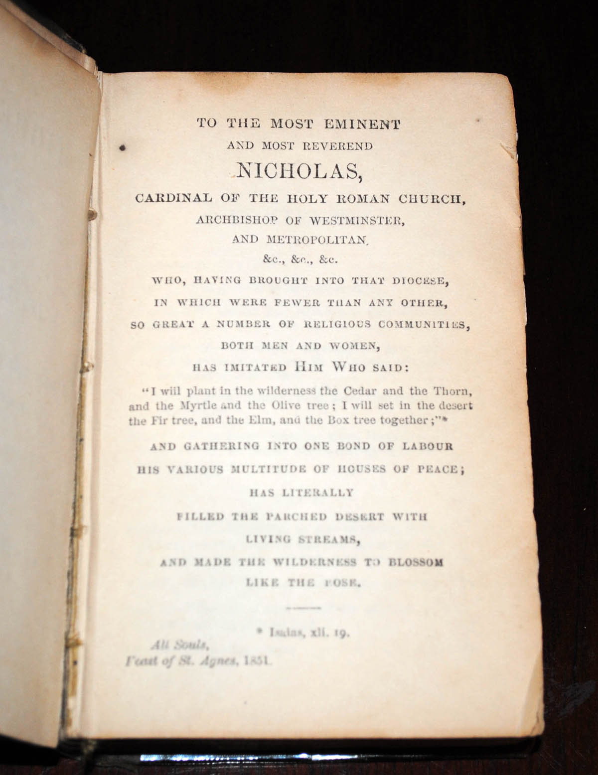 Verso of title page of a manual for the use of the Novices of the Holy Child Jesus, printed for use at the Convent St. Leonards-on-Sea in 1869. Translated by the SHCJ with dedication to Bishop Wiseman which was probably written by Cornelia. See also a photo of the manual. |