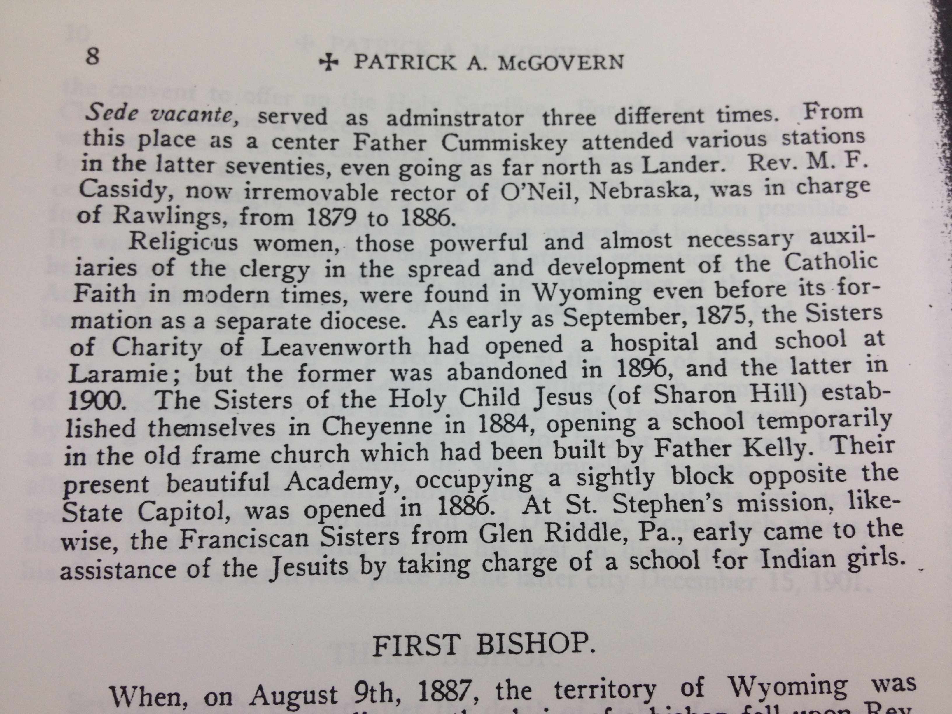 A brief history of the origins of the Holy Child Convent in Cheyenne, Wyoming from a book by Patrick A McGovern. |