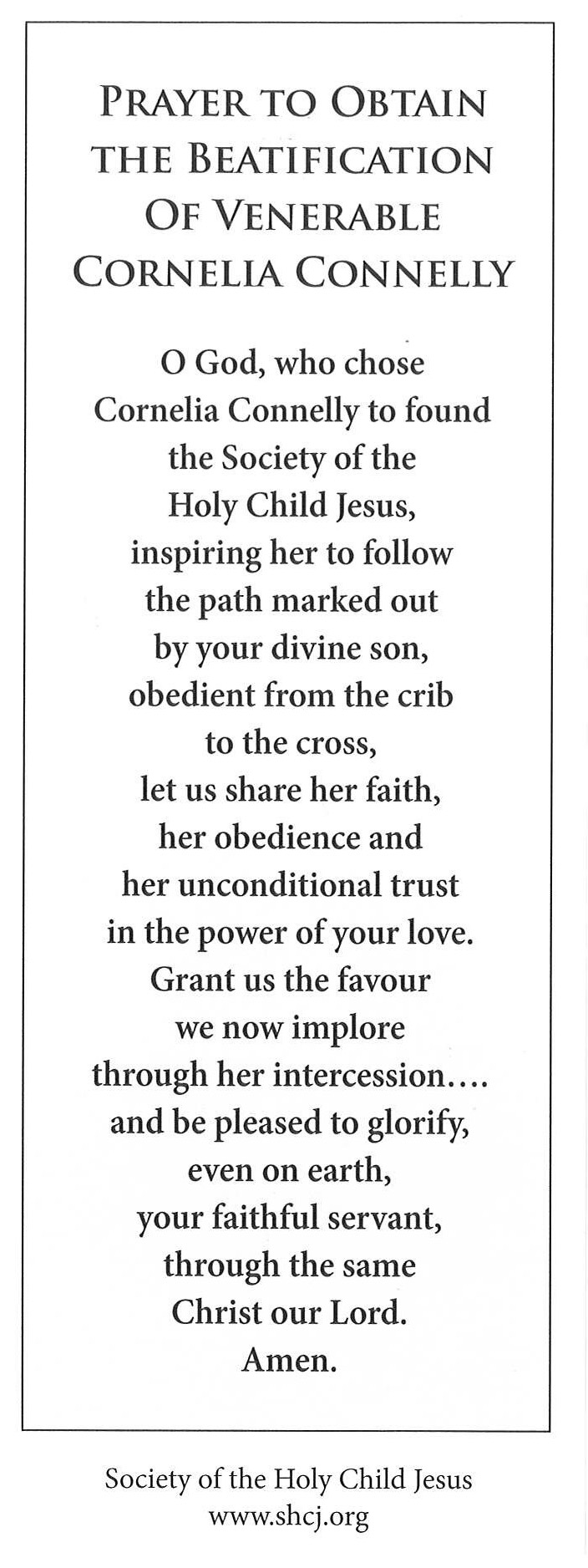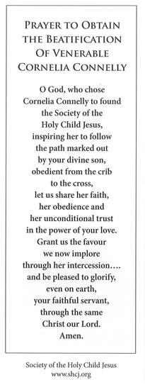 Bookmark with images of Cornelia and a prayer for beatification. Created in 2020.