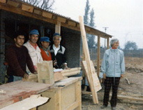 Centro Cornelia Connelly, Santiago, Chile (Evolved out of Santo Tomas, Comunidad Cristiana) Photo of Sr. Liz Barber with construction workers who are working on the first classrooms. |
