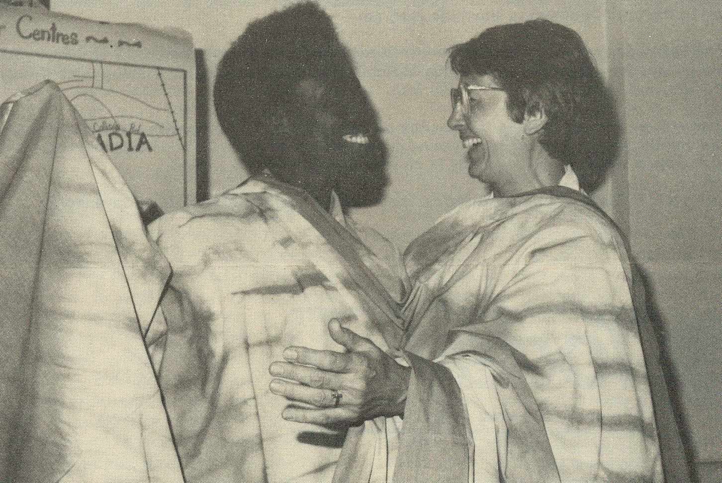 Dalton Center for Mission and Peace, E. 33rd Street, NY, NY, 1976-? Photo of "Sr. Bernadette Okure from the West African Vice-Province, stopped at Dalton Center on her way to Canada to deliver a paper on the Cardosa Project in Lagos, Nigeria. Sister is shown giving some Nigerian fabric to Sr. Catherine Hallahan, the originator and first director of Dalton Center." |