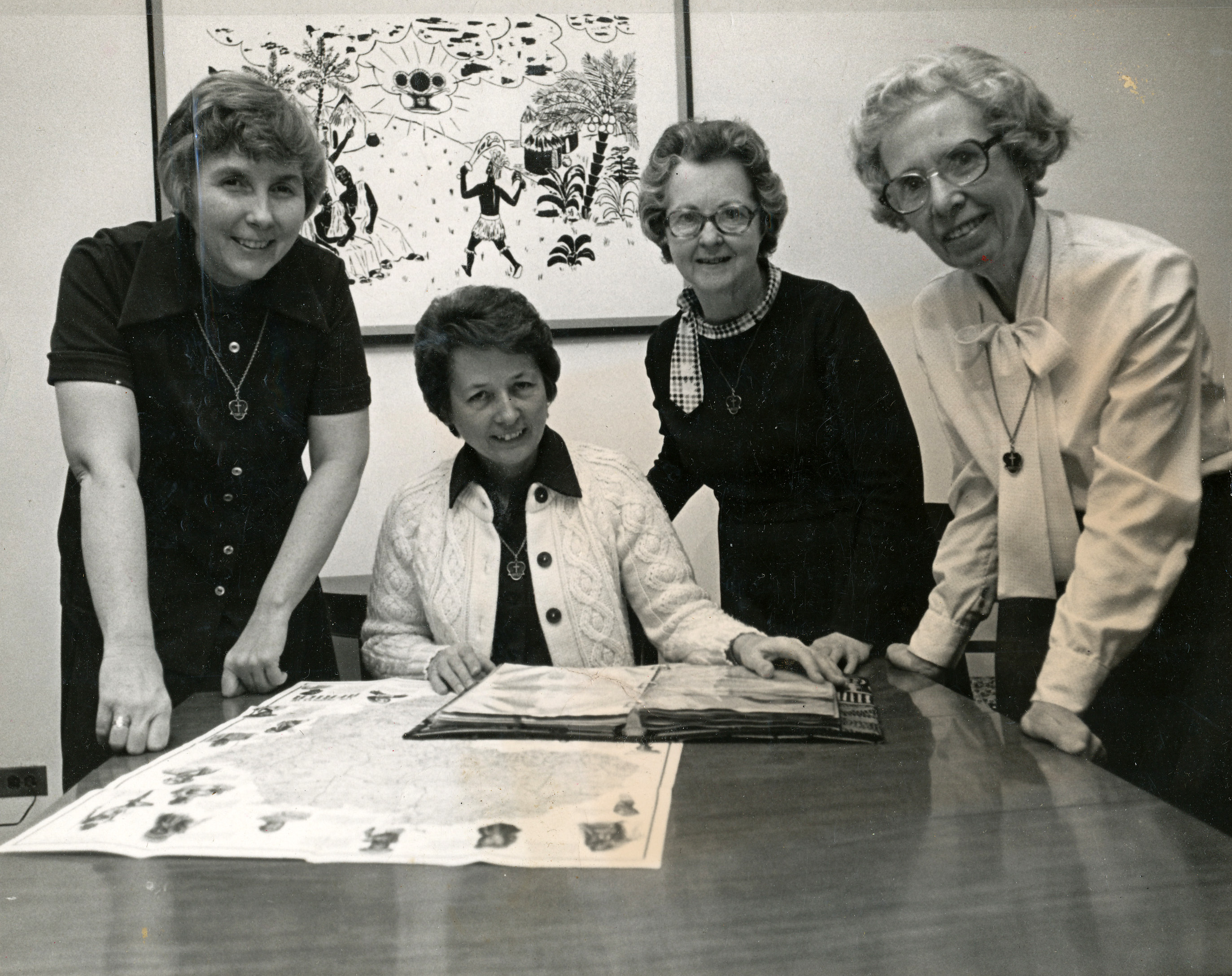 Dalton Center for Mission and Peace, E. 33rd Street, NY, NY, 1976-? Photo of early staff: Celine McInneny, Catherine Hallahan, Regina Logan, Catherine McKeaney. |