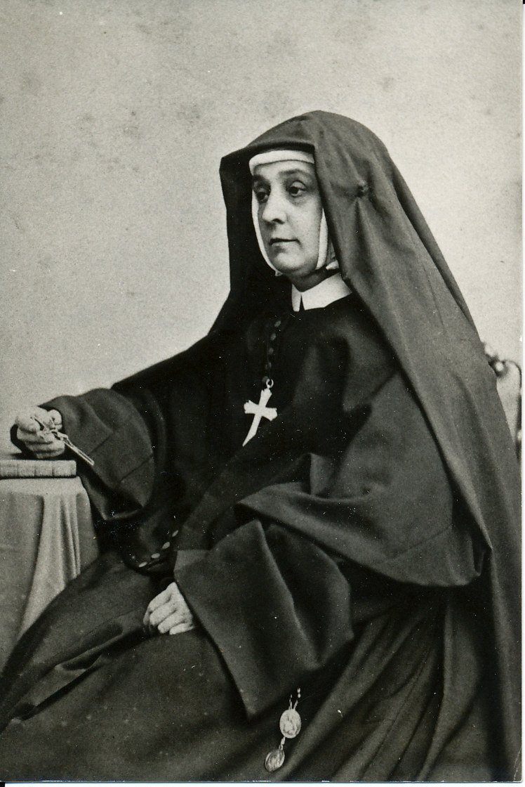 Photo of Cornelia Connelly. Apparently this photo and others like it, with the large cross on Cornelia's chest, are retouched photos as Cornelia was not known to have worn the Society cross during her lifetime. |