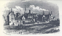 Sketch of first Holy Child Convent, Derby, England. L-R: laundry, kitchen, guests rooms, school, chapel, community. Chaplains' house with its own garden. |
