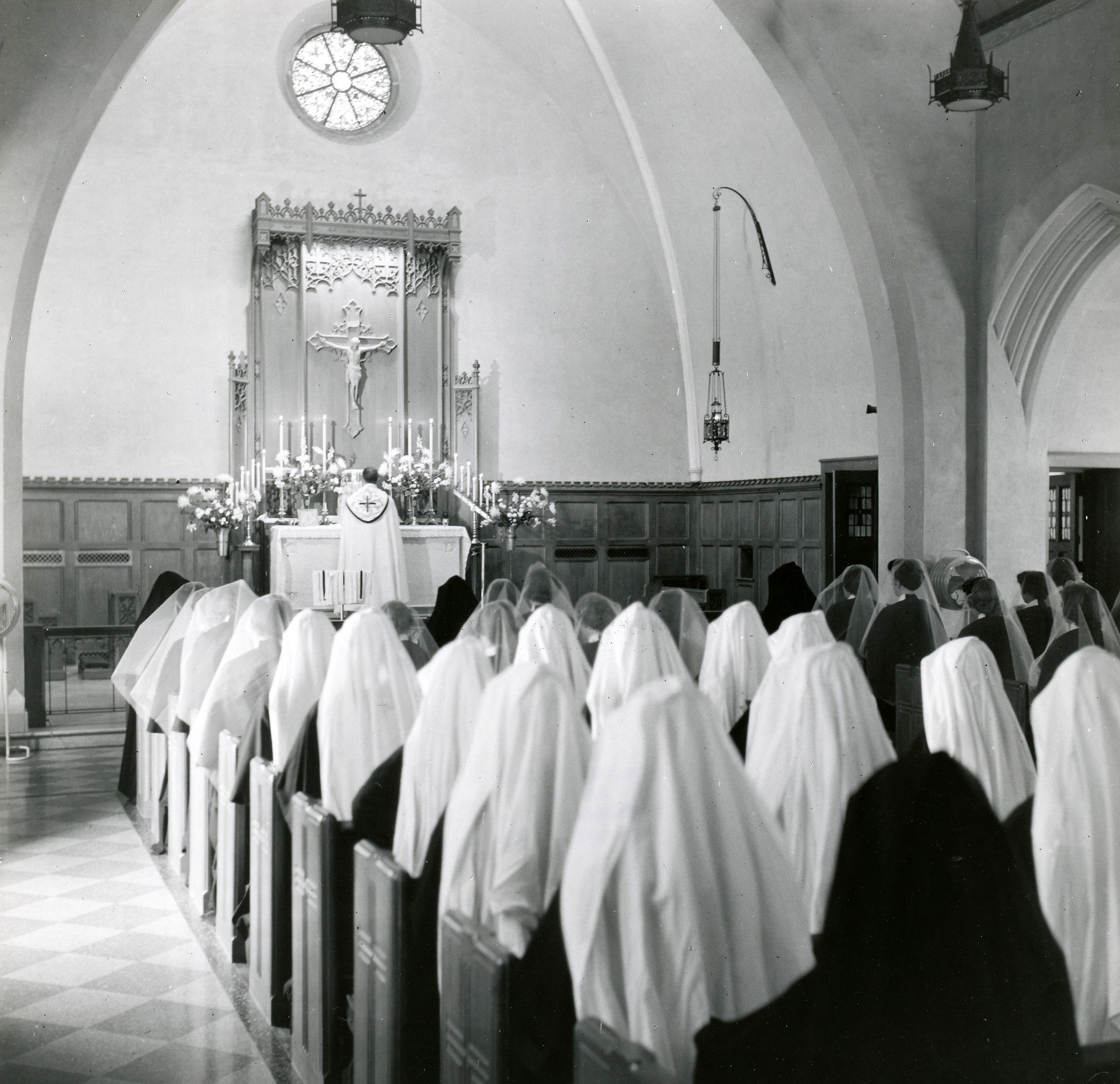 New Sharon, Convent and Infirmary, Rosemont, PA, 1946 - Originally known as Castaña. Photo of benediction before hooding of new postulents. |
