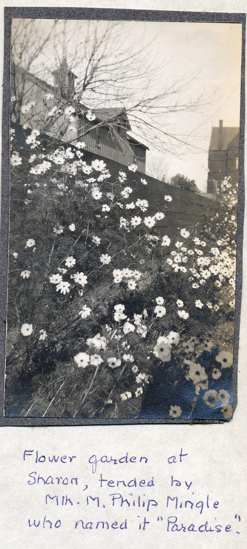 Sharon Convent, Sharon Hill, PA, 1864 - 1974. Photo of garden with inscription - "Flower garden at Sharon, tended by Mth. M. Philip Mingle who named it 'Paradise'." |