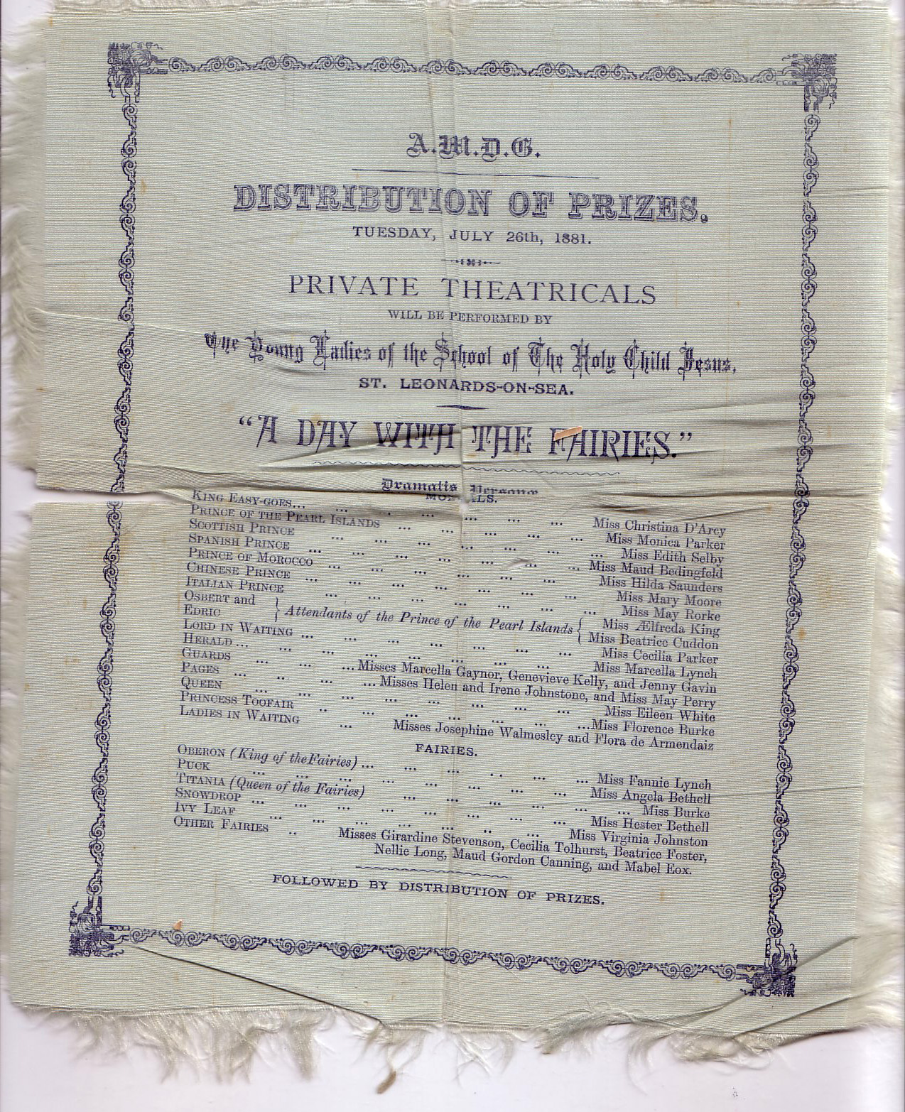 Convent of the Holy Child St. Leonards-on-Sea, England. Program from theatrical performance and distribution of prizes; printed on fabric. |