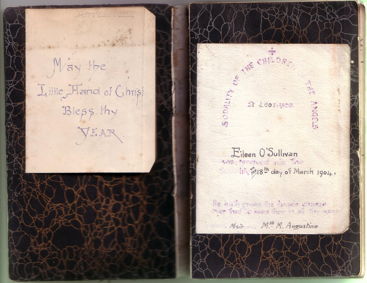 Convent of the Holy Child St. Leonards-on-Sea, England. Inside cover and pages from a student's (Eileen O'Sullivan) devotional journal. |