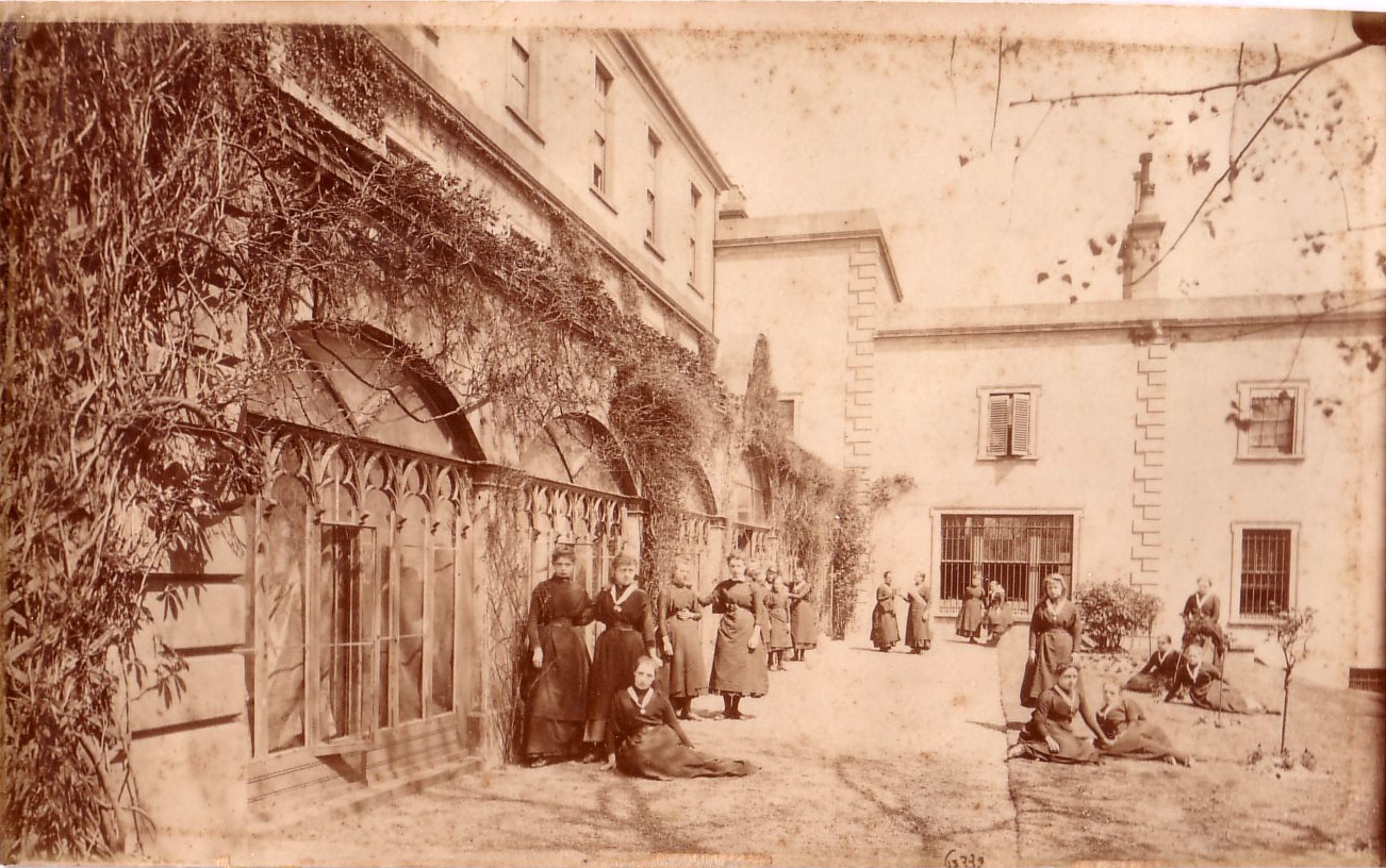 Convent of the Holy Child St. Leonards-on-Sea, England. Students in courtyard. |