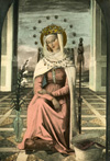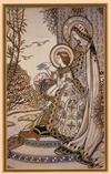 The Madonna and Child. Embroidery piece worked on cream satin with silk and gold thread erroneously attributed to SHCJ. One from a series of thirteen pieces. The full collection resides at The Royal School of Needlework. See "The Litany of Loredo Panels" for more information. |