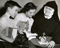 Student Registration St. James Parish School (later merged with St. Agatha) 34th and Sansom, Phila. - 1870-1967. Photo of M.M. Edwina, Principal (Edwina Menten) registering 2 students from the Ice Follies Troupe for School. |