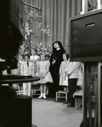 "Come Little Children" St. Leonard's Academy, Philadelphia, PA. Photo of Mother Mary Urban with children from St. Leonard's at NBC studios in Philadelphia taken before her program, "Come, Little Children." |